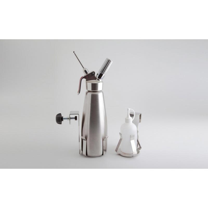 Her modelle kolay tutuş sağlar. Ayarlanabilir klipsi, istediğiniz sıklıkta değiştirmeye izin verir ve çapı 12 ila 5 cm arasında olan herhangi bir kap veya sifona uyum sağlar. Herhangi bir sifon veya küçük şişe, tam sıcaklıkta soslar, köpükler içeren banyoya daldırılacaktır.