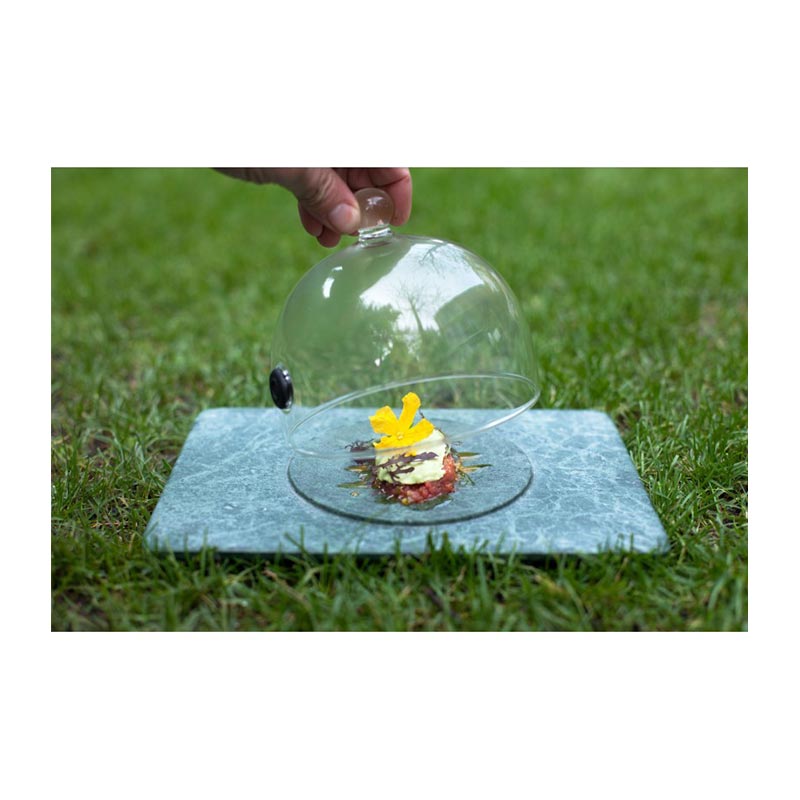 Çan ile sunmak için platformlu çanak. Özel yeşil Macael mermerinden oyulmuştur. Düz oyulmuş kısım, sosu platformun içinde tutmak için hafif bir içbükeyliğe sahiptir. Çanak da tersine çevrilebilir. Geniş ve orijinal kataloğumuz ihtiyacınız olan boyut ve renge göre özelleştirilebilir. Kapak 14cm Dahil DEĞİLDİR.