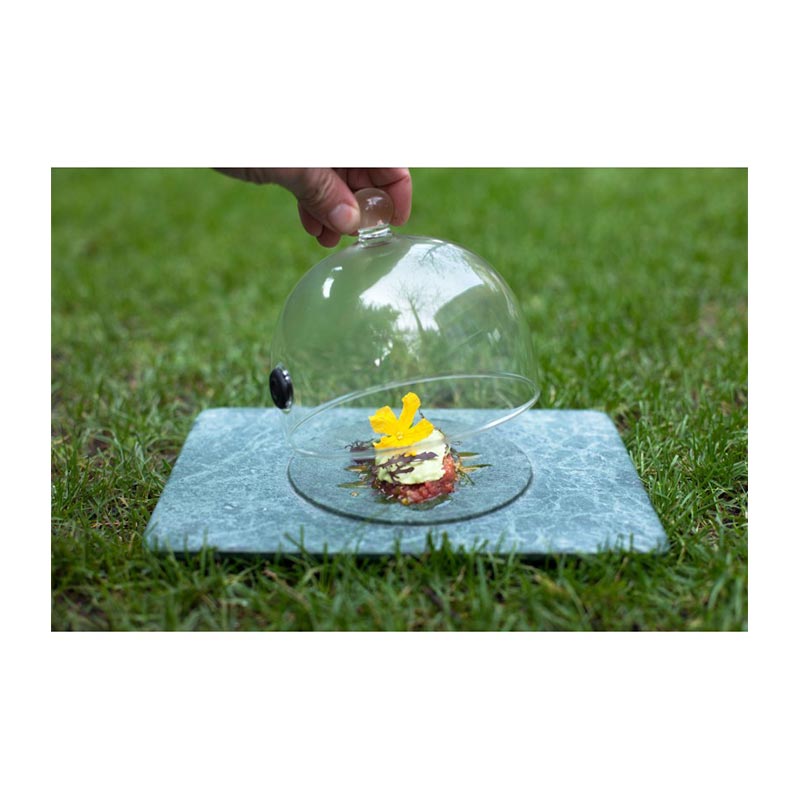 Çan ile sunmak için platformlu çanak. Özel yeşil Macael mermerinden oyulmuştur. Düz oyulmuş kısım, sosu platformun içinde tutmak için hafif bir içbükeyliğe sahiptir. Çanak da tersine çevrilebilir. Geniş ve orijinal kataloğumuz ihtiyacınız olan boyut ve renge göre özelleştirilebilir. Kapak 18 cm Dahil DEĞİLDİR.