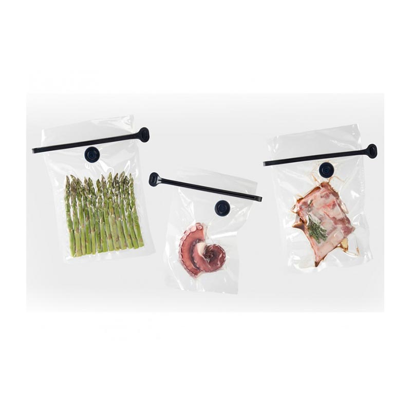 Click-it sisteminin klipsi, her türlü plastik poşeti saklama için kapatmanıza ve ayrıca koşullandırılmış ürünlerin zarflarını vakumlu muhafaza poşetlerine dönüştürmenize olanak tanır. Tahılların, tohumların, kahvenin tazeliğini koruyarak ekşiliği önler, marine edilmesine ve mükemmel et ve balık pişirilmesine olanak sağlar. -40 ° C ile 100 ° C arasındaki sıcaklıklara dayanacak şekilde test edilmiş vakumlu pişirme poşetlerimizi kullanarak, Noon (ref. 80/0058 - 80/0059) ile mükemmel bir sonuç elde edeceksiniz. Click-It Kit herhangi bir cihazla kullanılabilir.