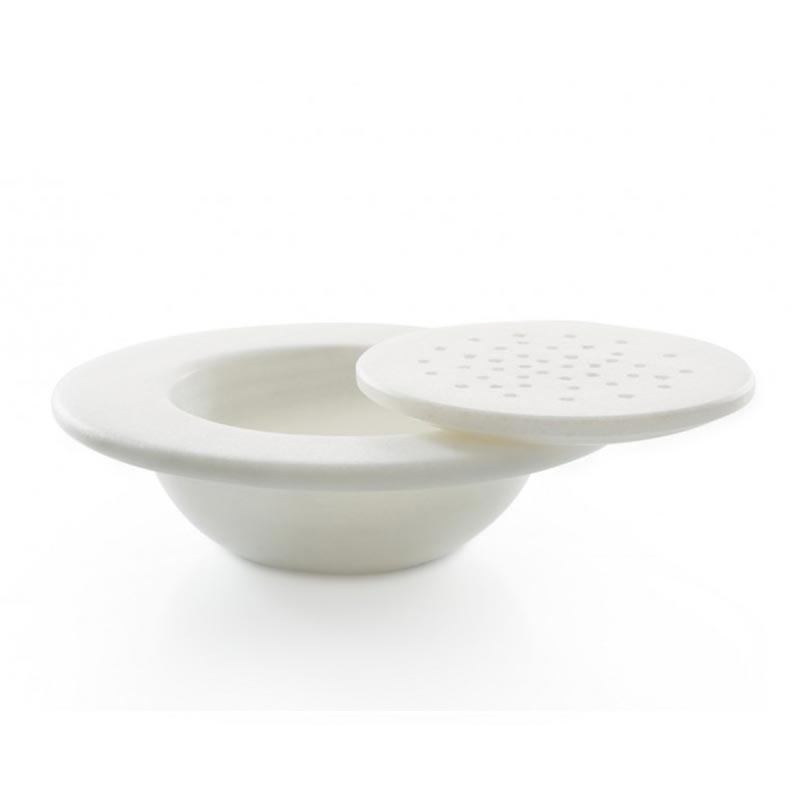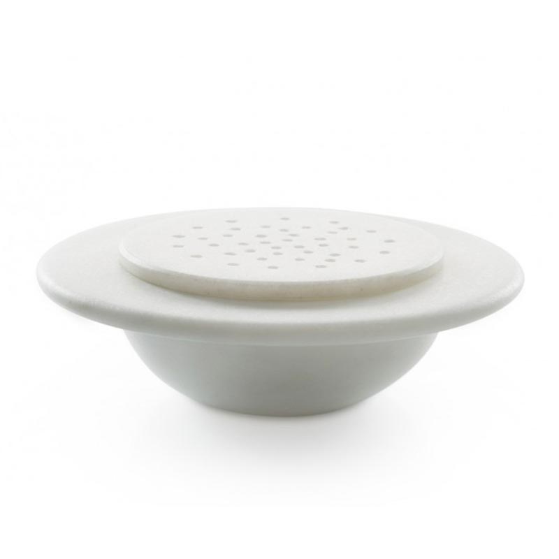 Soğuk beyaz kase ile uyumlu beyaz mermer üst. Delikli yüzeyi aromaların süblimleşmesine yardımcı olur. Sıvı nitrojen veya kuru buz peletleri ile üretilen duman veya sis.