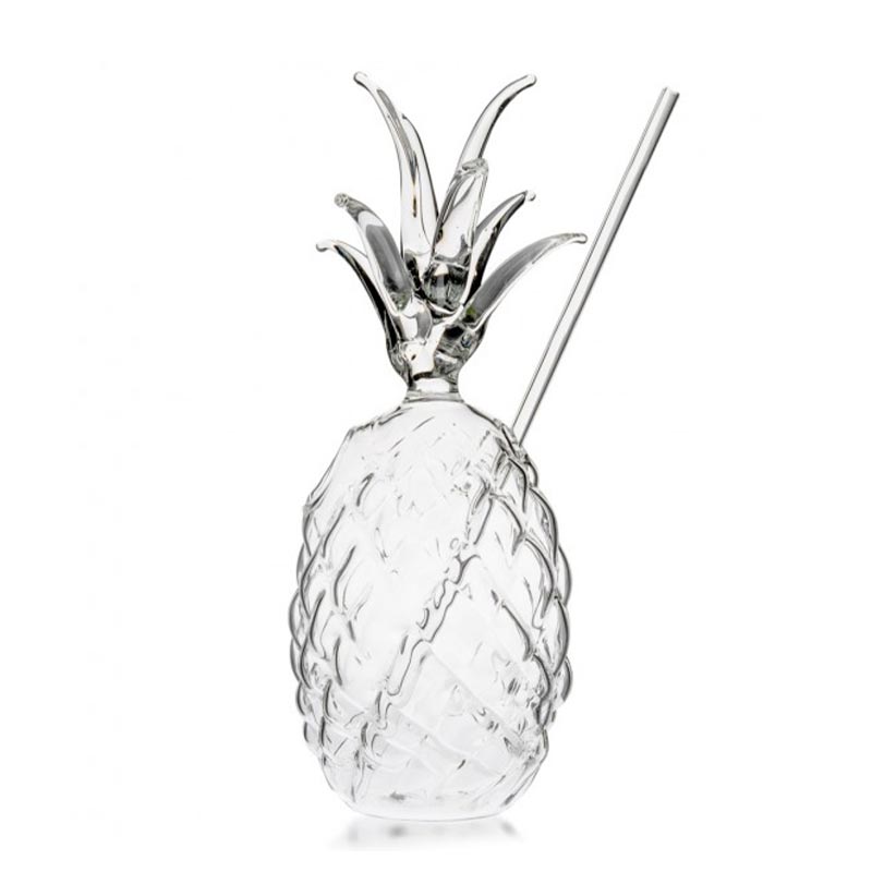Yapraklı ananas şeklindeki cam. Borosilikat cam içinde üflenmiş cam. Ferahlatıcı meyve suları, kokteyller servis edin, her şey yolunda! Buzla doldurmak için özel bir delik ve kamış için daha küçük bir delik. 20 cm cam pipeti içerir.