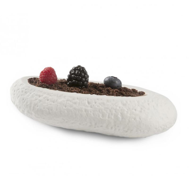Doğadan esinlenen porselen tabaklar, pamuk kadar hafif olmasına rağmen taşların dokusunu ve rengini taklit eder. Beyaz mat renkli emaye yüzeyler, soslardan lekelere veya renk geçişine tam dayanıklıdır. Yiyeceklerin sunum alanında bulunan yüzeyler, çatal bıçakların bulaşıklara çarpmasını önlemek için pürüzsüzdür.