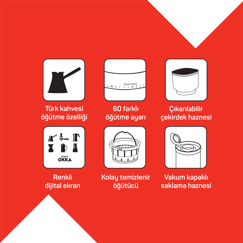 · Türk Kahvesi Modu: Özel geliştirilmiş öğütme teknolojisi sayesinde, en ince öğütme tipi olan "Türk Kahvesi" için öğütme yapabilir.