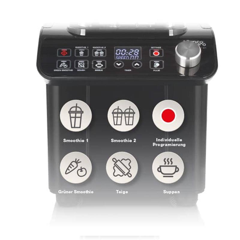 Önceden tanımlanmış 5 ve ayrı ayrı ayarlanabilir 5 karışım programı, Gusto Pro'nun yarattığı mükemmel izlenimi tamamlar. Ticari kullanım için motor bloğunda 5 yıllık garanti, profesyoneller için bu sofistike güç karıştırıcısı için de geçerlidir.