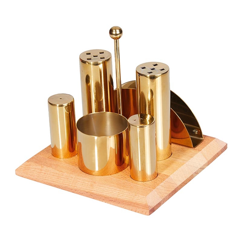 Biradlı GRV-49 Набор шейкеров для соли и специй с деревянной подставкой, 5 шт, золото