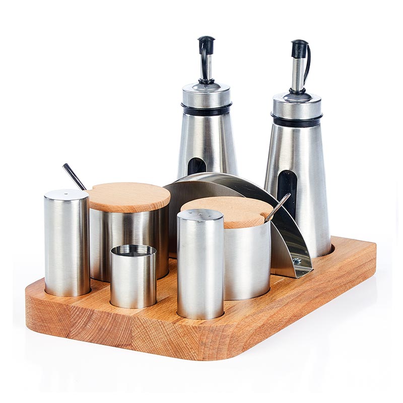 Biradlı 8'li Baharatlık ve Yağlık Takımı, Ahşap Tabanlı, 150 cc