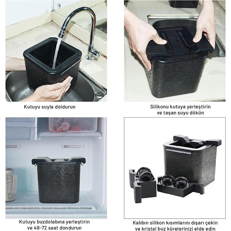 Dört Büyük Buz Topu: Aynı anda dört büyük 6 cm kristal berraklığında buz topu yapmanın keyfini çıkarabilirsiniz. Esnek silikon sayesinde buz toplarınızı buz küresi kalıbından kolayca çıkarabilirsiniz.