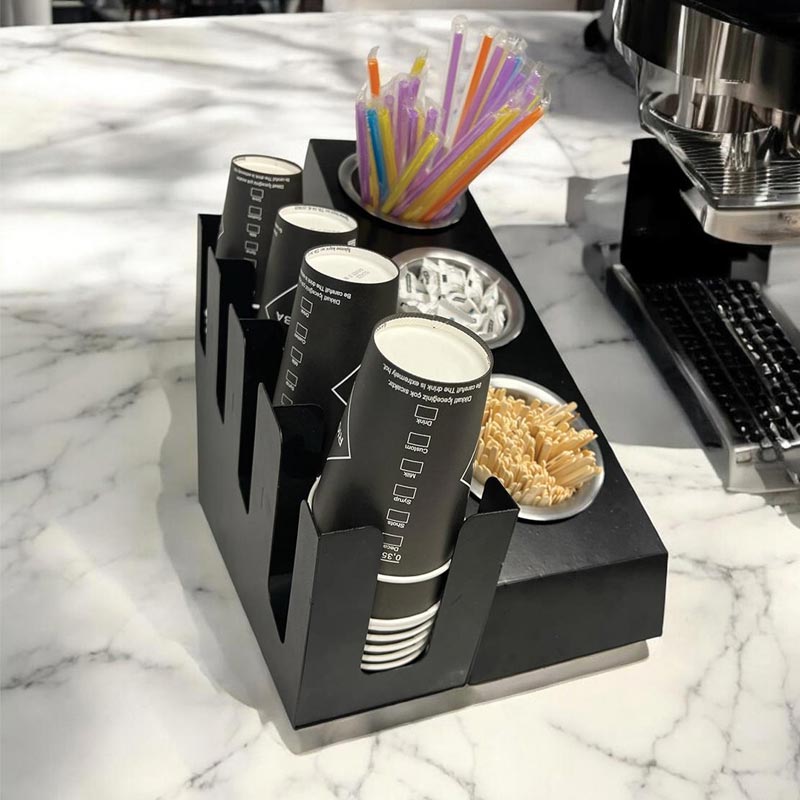 Kapsamlı Depolama: Farklı boyutlardaki bölmeleri ile kâğıt bardaklardan pipetlere kadar birçok kahve aksesuarını rahatlıkla organize edebilirsiniz.