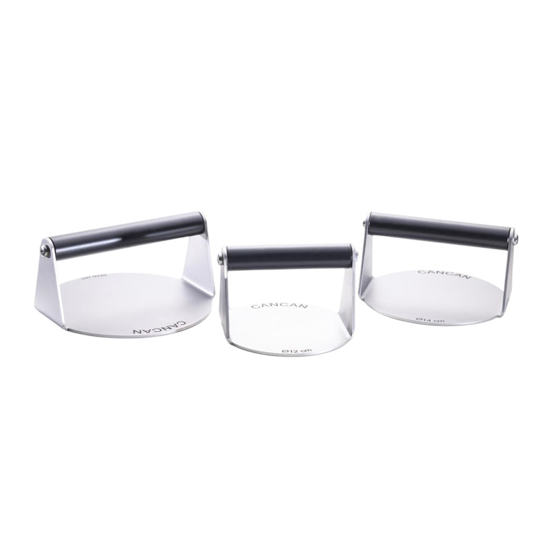 Smash Burger Press, burger köftelerini tek hamlede bastırarak hızlı karamelizasyon ve eşit pişirme sağlar. 12 cm, 14 cm ve 16 cm çap seçenekleriyle sunulur. Paslanmaz çelik tabanı ve ergonomik ahşap sapı sayesinde hem profesyonel mutfaklarda hem de evde tutarlı sonuçlar elde etmenizi sağlar.