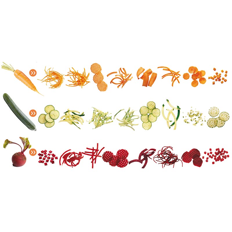 Elle yapılan işlerden her gün birkaç saat tasarruf edin: dilimleyin, rendeleyin, dalgalı dilimler kesin, jülyen veya kuşbaşı doğrayın, parmak patates kesin, hatta püre yapın.