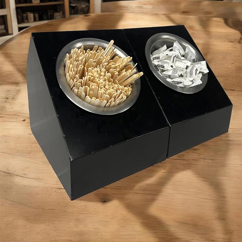 • Bu görüntüde, masa üstü düzenleyici veya kaşık tutucusu olarak bilinen bir mutfak ürünü yer almaktadır. Ürün, siyah kaplamalı metal bir gövdeye sahip olup, içerisinde iki adet paslanmaz çelik kâse bulunmaktadır. Kaselerin içine, kaşıklar düzgün bir biçimde yerleştirilmiştir. Bu ürün, genellikle restoran veya kafelerde, kahve hazırlama istasyonlarında kullanılan pratik bir düzenleme aracıdır. Bu tür ürünler hem işlevsel hem de estetik bir kullanım sunarak, masa üstünün düzenli kalmasına yardımcı olur.