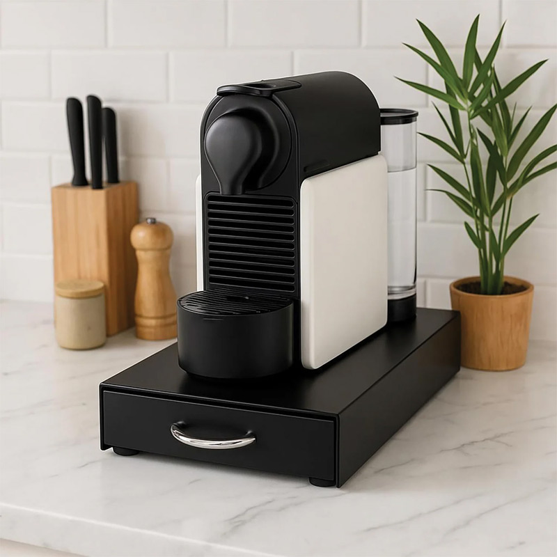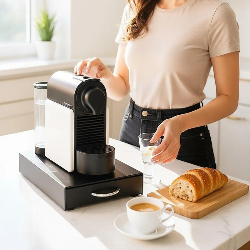 Kahve makinesinin altına yerleştirilebilir yapısı sayesinde tezgâh alanını verimli kullanmanızı sağlar.