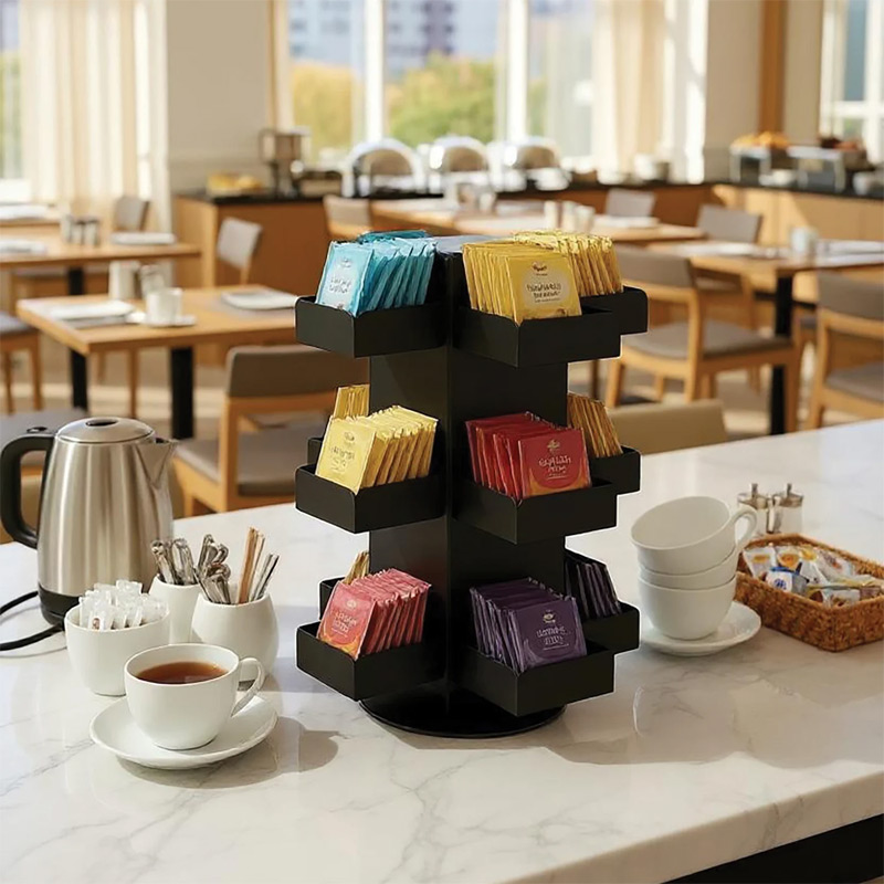 Sadece çay için değil, stick şeker, kahve veya küçük paketli soslar için de düzenleyici olarak kullanılabilir.
