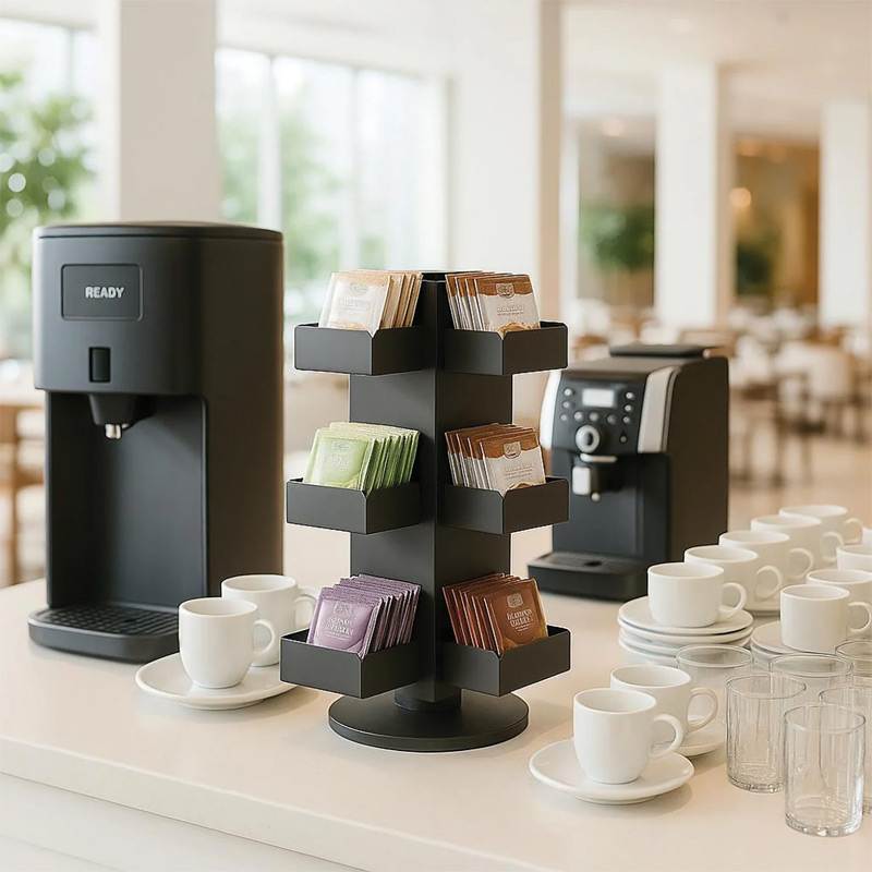 Standı çevirerek tüm çay çeşitlerine oturduğunuz yerden kolayca erişebilirsiniz.