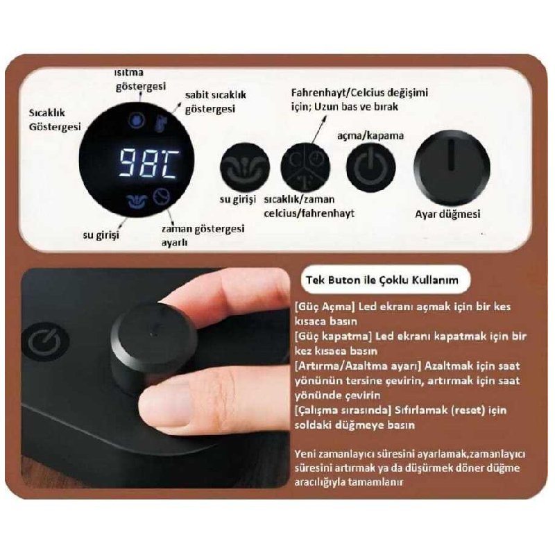 Elektrikli tabanı sayesinde pratik kullanım sunan model, görsellerde yer alan dijital sıcaklık göstergesi ve ayar düğmesiyle su sıcaklığının daha kolay takip edilmesini sağlar. Tek düğmeli kontrol yapısı; sıcaklık ayarı, başlatma/durdurma ve ekran kullanımı gibi işlemleri daha sade hale getirir. °C / °F sıcaklık gösterimi, farklı kullanım alışkanlıklarına uygun esneklik sağlar.
