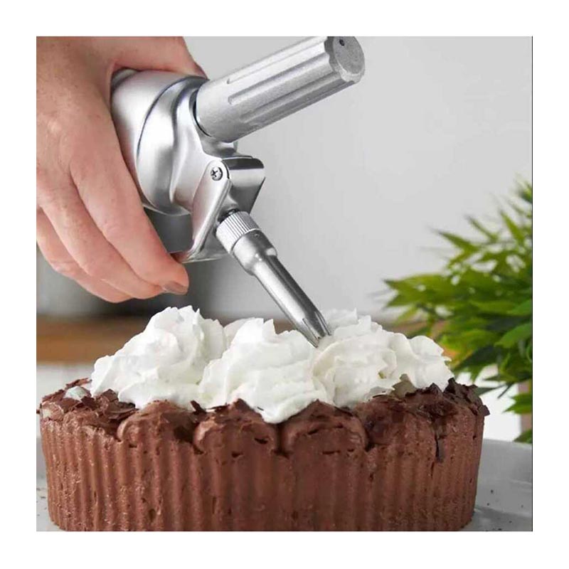 • Sıkma işlemi için, dekorasyon duyu aşağı bakacak şekilde şişeyi dik tutun. Duy ile kremayı sıkacağınız yüzey arasında yaklaşık 1 cm mesafe olmalıdır. Hafifçe tetiğe basın, eğer krema yeteri kadar sert değilse şişeyi bir kez daha çalkalayın. Kullanmaya devam ederken yeniden çalkalamayın.