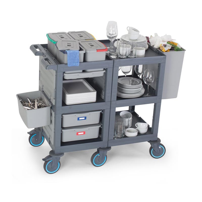 Kullanım alanları daha dar olan restaurant, otel, okul ve hastane gibi işletmelerin servis hizmetlerinde tercih edilir. Kolayca hareket edebilen sessiz, tamponlu ve frenli tekerlekleri sayesinde çarpmalara karşı dayanıklıdır. Frenli tekerlekler ile eğik düzlemlerde sabitleme imkanı sunar. Esnek özellikleriyle hızlı ve pratik bir şekilde servis yapma imkanı sağlar. Modüler ve ergonomik yapısı ile işlerinizi kolaylaştırır. Komple gövde yapısının plastik olması, iç ve dış mekan kullanımlarına olanak sağlar, su ile yapılan temizliklerden hiç bir şekilde etkilenmez ve paslanma yapmaz, ürünün hammaddesinde kimyasal maddelere ve ısıya dayanıklı Poli Propilen malzeme kullanılmıştır.  Üç adet rafı ve iki taraflı itme sapı kullanıcılarına daha rahat iş yapma ve servis olanağı sunmaktadır.