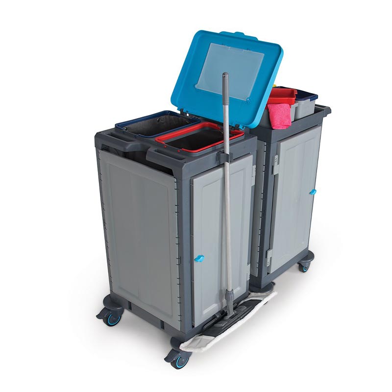 Alışveriş merkezleri, hastane, okul, yurt, fabrika, otel, rezidans gibi işletmelerin temizlik hizmetlerinde pratiklik ve standart sağlar. Kolayca hareket edebilen sessiz, tamponlu ve frenli tekerlekleri sayesinde çarpmalara karşı dayanıklıdır. Frenli tekerlekler ile eğik düzlemlerde sabitleme imkanı sunar. Esnek özellikleriyle hızlı ve pratik bir şekilde servis yapma ve atık toplama imkanı sağlar. Modüler ve ergonomik yapısı ile işlerinizi kolaylaştırır. Opsiyonel aksesuarı ile atık bölmenizi 2 x 60 lt olarak kullanma imkanı sunar. Komple gövde yapısının plastik olması, iç ve dış mekan kullanımlarına olanak sağlar, su ile yapılan temizliklerden hiç bir şekilde etkilenmez ve paslanma yapmaz, ürünün hammaddesinde kimyasal maddelere ve ısıya dayanıklı Poli Propilen malzeme kullanılmıştır. Dört tarafı kapalı iki taraftan açılabilir dolap bölmesi ve tepsili raf sistemi temizlik malzemelerinizi saklama ve depolama imkanı sunar. Modülde kapaklı dolabın her iki yanında, herbiri 120 lt hacminde 2 adet atık toplama imkanı da kullanıcılarına ayrıca sunulmaktadır. Çöp torba kilitleri sayesinde kullanım rahatlığı sağlar. Çöp kapakları üzerindeki atık sınıflandırma renk etiketleri ve görev çizelgeliği sayesinde, birbirinden farklı alanlar için sınıflandırma ve görevliyi denetim imkanı sunarak, uluslararası standartlarda hijyenik ve sağlıklı bir temizlik imkanı sunar.