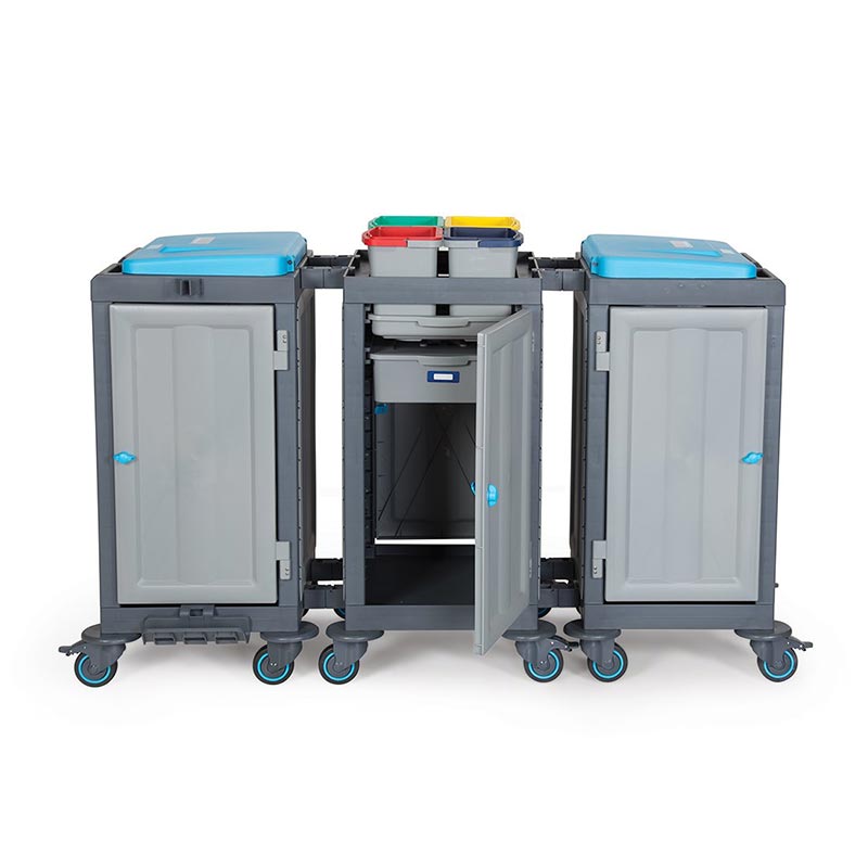 Alışveriş merkezleri, hastane, okul, yurt, fabrika, otel, rezidans gibi işletmelerin temizlik hizmetlerinde pratiklik ve standart sağlar. Kolayca hareket edebilen sessiz, tamponlu ve frenli tekerlekleri sayesinde çarpmalara karşı dayanıklıdır. Frenli tekerlekler ile eğik düzlemlerde sabitleme imkanı sunar. Esnek özellikleriyle hızlı ve pratik bir şekilde servis yapma ve atık toplama imkanı sağlar. Modüler ve ergonomik yapısı ile işlerinizi kolaylaştırır. Opsiyonel aksesuarı ile atık bölmenizi 2 x 60 lt olarak kullanma imkanı sunar. Komple gövde yapısının plastik olması, iç ve dış mekan kullanımlarına olanak sağlar, su ile yapılan temizliklerden hiç bir şekilde etkilenmez ve paslanma yapmaz, ürünün hammaddesinde kimyasal maddelere ve ısıya dayanıklı Poli Propilen malzeme kullanılmıştır. Dört tarafı kapalı iki taraftan açılabilir dolap bölmesi ve tepsili raf sistemi temizlik malzemelerinizi saklama ve depolama imkanı sunar. Modülde kapaklı dolabın her iki yanında, herbiri 120 lt hacminde 2 adet atık toplama imkanı da kullanıcılarına ayrıca sunulmaktadır. Çöp torba kilitleri sayesinde kullanım rahatlığı sağlar. Çöp kapakları üzerindeki atık sınıflandırma renk etiketleri ve görev çizelgeliği sayesinde, birbirinden farklı alanlar için sınıflandırma ve görevliyi denetim imkanı sunarak, uluslararası standartlarda hijyenik ve sağlıklı bir temizlik imkanı sunar.