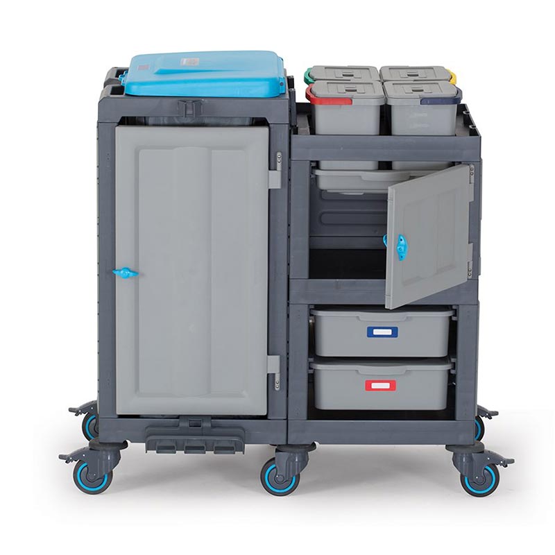 Alışveriş merkezleri, hastane, okul, yurt, fabrika, otel, rezidans gibi işletmelerin temizlik hizmetlerinde pratiklik ve standart sağlar. Kolayca hareket edebilen sessiz, tamponlu ve frenli tekerlekleri sayesinde çarpmalara karşı dayanıklıdır. Frenli tekerlekler ile eğik düzlemlerde sabitleme imkanı sunar. Esnek özellikleriyle hızlı ve pratik bir şekilde servis yapma ve atık toplama imkanı sağlar. Modüler ve ergonomik yapısı ile işlerinizi kolaylaştırır. Opsiyonel aksesuarı ile atık bölmenizi 2 x 60 lt olarak kullanma imkanı sunar. Komple gövde yapısının plastik olması, iç ve dış mekan kullanımlarına olanak sağlar, su ile yapılan temizliklerden hiç bir şekilde etkilenmez ve paslanma yapmaz, ürünün hammaddesinde kimyasal maddelere ve ısıya dayanıklı Poli Propilen malzeme kullanılmıştır. Dört tarafı kapalı iki taraftan açılabilir dolap bölmesi ve tepsili raf sistemi temizlik malzemelerinizi saklama ve depolama imkanı sunar. Modülde kapaklı dolabın her iki yanında, herbiri 120 lt hacminde 2 adet atık toplama imkanı da kullanıcılarına ayrıca sunulmaktadır. Çöp torba kilitleri sayesinde kullanım rahatlığı sağlar. Çöp kapakları üzerindeki atık sınıflandırma renk etiketleri ve görev çizelgeliği sayesinde, birbirinden farklı alanlar için sınıflandırma ve görevliyi denetim imkanı sunarak, uluslararası standartlarda hijyenik ve sağlıklı bir temizlik imkanı sunar.