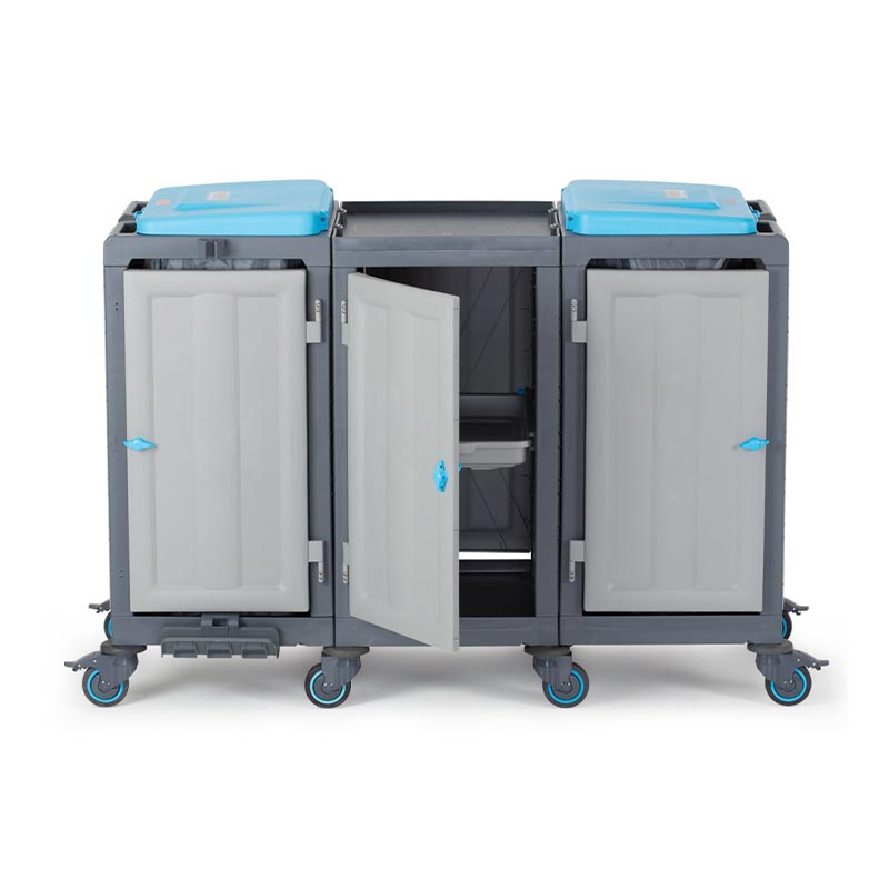 Alışveriş merkezleri, hastane, okul, yurt, fabrika, otel, rezidans gibi işletmelerin temizlik hizmetlerinde pratiklik ve standart sağlar. Kolayca hareket edebilen sessiz, tamponlu ve frenli tekerlekleri sayesinde çarpmalara karşı dayanıklıdır. Frenli tekerlekler ile eğik düzlemlerde sabitleme imkanı sunar. Esnek özellikleriyle hızlı ve pratik bir şekilde servis yapma ve atık toplama imkanı sağlar. Modüler ve ergonomik yapısı ile işlerinizi kolaylaştırır. Opsiyonel aksesuarı ile atık bölmenizi 2 x 60 lt olarak kullanma imkanı sunar. Komple gövde yapısının plastik olması, iç ve dış mekan kullanımlarına olanak sağlar, su ile yapılan temizliklerden hiç bir şekilde etkilenmez ve paslanma yapmaz, ürünün hammaddesinde kimyasal maddelere ve ısıya dayanıklı Poli Propilen malzeme kullanılmıştır. Dört tarafı kapalı iki taraftan açılabilir dolap bölmesi ve tepsili raf sistemi temizlik malzemelerinizi saklama ve depolama imkanı sunar. Modülde kapaklı dolabın her iki yanında, herbiri 120 lt hacminde 2 adet atık toplama imkanı da kullanıcılarına ayrıca sunulmaktadır. Çöp torba kilitleri sayesinde kullanım rahatlığı sağlar. Çöp kapakları üzerindeki atık sınıflandırma renk etiketleri ve görev çizelgeliği sayesinde, birbirinden farklı alanlar için sınıflandırma ve görevliyi denetim imkanı sunarak, uluslararası standartlarda hijyenik ve sağlıklı bir temizlik imkanı sunar.