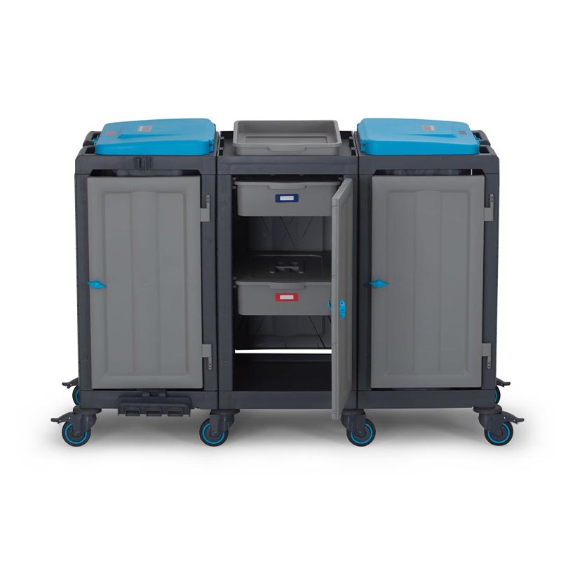Alışveriş merkezleri, hastane, okul, yurt, fabrika, otel, rezidans gibi işletmelerin temizlik hizmetlerinde pratiklik ve standart sağlar. Kolayca hareket edebilen sessiz, tamponlu ve frenli tekerlekleri sayesinde çarpmalara karşı dayanıklıdır. Frenli tekerlekler ile eğik düzlemlerde sabitleme imkanı sunar. Esnek özellikleriyle hızlı ve pratik bir şekilde servis yapma ve atık toplama imkanı sağlar. Modüler ve ergonomik yapısı ile işlerinizi kolaylaştırır. Opsiyonel aksesuarı ile atık bölmenizi 2 x 60 lt olarak kullanma imkanı sunar. Komple gövde yapısının plastik olması, iç ve dış mekan kullanımlarına olanak sağlar, su ile yapılan temizliklerden hiç bir şekilde etkilenmez ve paslanma yapmaz, ürünün hammaddesinde kimyasal maddelere ve ısıya dayanıklı Poli Propilen malzeme kullanılmıştır. Dört tarafı kapalı iki taraftan açılabilir dolap bölmesi ve tepsili raf sistemi temizlik malzemelerinizi saklama ve depolama imkanı sunar. Modülde kapaklı dolabın her iki yanında, herbiri 120 lt hacminde 2 adet atık toplama imkanı da kullanıcılarına ayrıca sunulmaktadır. Çöp torba kilitleri sayesinde kullanım rahatlığı sağlar. Çöp kapakları üzerindeki atık sınıflandırma renk etiketleri ve görev çizelgeliği sayesinde, birbirinden farklı alanlar için sınıflandırma ve görevliyi denetim imkanı sunarak, uluslararası standartlarda hijyenik ve sağlıklı bir temizlik imkanı sunar.