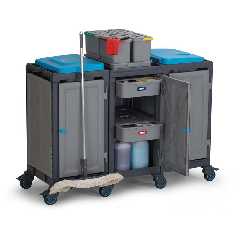 Alışveriş merkezleri, hastane, okul, yurt, fabrika, otel, rezidans gibi işletmelerin temizlik hizmetlerinde pratiklik ve standart sağlar. Kolayca hareket edebilen sessiz, tamponlu ve frenli tekerlekleri sayesinde çarpmalara karşı dayanıklıdır. Frenli tekerlekler ile eğik düzlemlerde sabitleme imkanı sunar. Esnek özellikleriyle hızlı ve pratik bir şekilde servis yapma ve atık toplama imkanı sağlar. Modüler ve ergonomik yapısı ile işlerinizi kolaylaştırır. Opsiyonel aksesuarı ile atık bölmenizi 2 x 60 lt olarak kullanma imkanı sunar. Komple gövde yapısının plastik olması, iç ve dış mekan kullanımlarına olanak sağlar, su ile yapılan temizliklerden hiç bir şekilde etkilenmez ve paslanma yapmaz, ürünün hammaddesinde kimyasal maddelere ve ısıya dayanıklı Poli Propilen malzeme kullanılmıştır. Dört tarafı kapalı iki taraftan açılabilir dolap bölmesi ve tepsili raf sistemi temizlik malzemelerinizi saklama ve depolama imkanı sunar. Modülde kapaklı dolabın her iki yanında, herbiri 120 lt hacminde 2 adet atık toplama imkanı da kullanıcılarına ayrıca sunulmaktadır. Çöp torba kilitleri sayesinde kullanım rahatlığı sağlar. Çöp kapakları üzerindeki atık sınıflandırma renk etiketleri ve görev çizelgeliği sayesinde, birbirinden farklı alanlar için sınıflandırma ve görevliyi denetim imkanı sunarak, uluslararası standartlarda hijyenik ve sağlıklı bir temizlik imkanı sunar.
