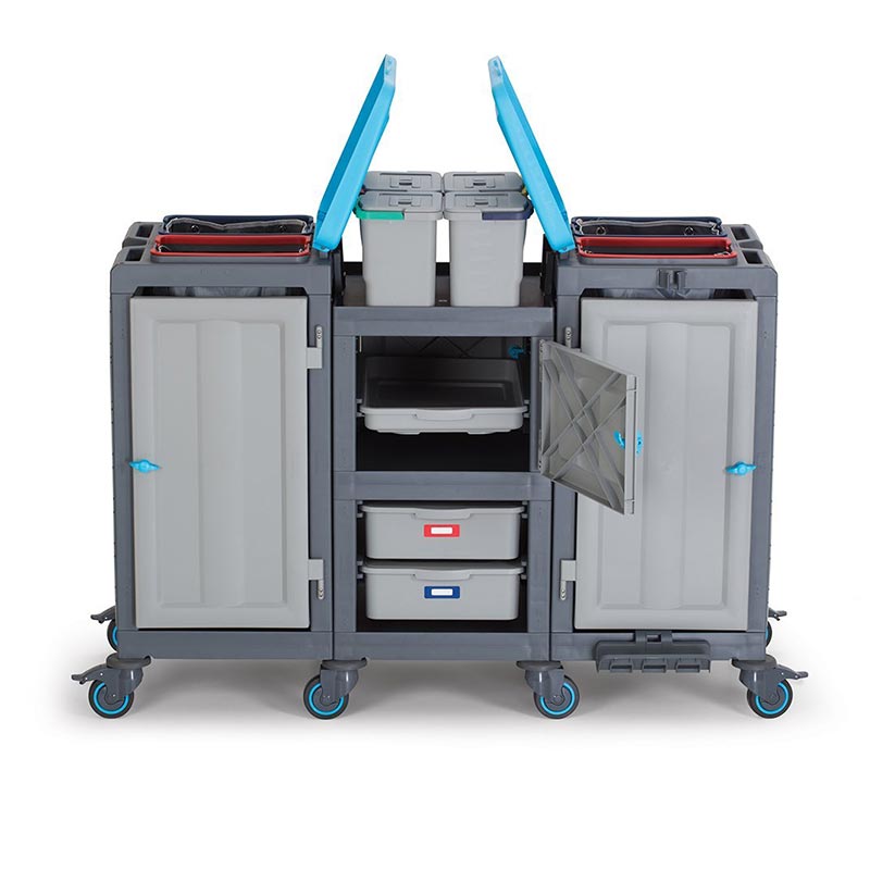 Alışveriş merkezleri, hastane, okul, yurt, fabrika, otel, rezidans gibi işletmelerin temizlik hizmetlerinde pratiklik ve standart sağlar. Kolayca hareket edebilen sessiz, tamponlu ve frenli tekerlekleri sayesinde çarpmalara karşı dayanıklıdır. Frenli tekerlekler ile eğik düzlemlerde sabitleme imkanı sunar. Esnek özellikleriyle hızlı ve pratik bir şekilde servis yapma ve atık toplama imkanı sağlar. Modüler ve ergonomik yapısı ile işlerinizi kolaylaştırır. Opsiyonel aksesuarı ile atık bölmenizi 2 x 60 lt olarak kullanma imkanı sunar. Komple gövde yapısının plastik olması, iç ve dış mekan kullanımlarına olanak sağlar, su ile yapılan temizliklerden hiç bir şekilde etkilenmez ve paslanma yapmaz, ürünün hammaddesinde kimyasal maddelere ve ısıya dayanıklı Poli Propilen malzeme kullanılmıştır. Dört tarafı kapalı iki taraftan açılabilir dolap bölmesi ve tepsili raf sistemi temizlik malzemelerinizi saklama ve depolama imkanı sunar. Modülde kapaklı dolabın her iki yanında, herbiri 120 lt hacminde 2 adet atık toplama imkanı da kullanıcılarına ayrıca sunulmaktadır. Çöp torba kilitleri sayesinde kullanım rahatlığı sağlar. Çöp kapakları üzerindeki atık sınıflandırma renk etiketleri ve görev çizelgeliği sayesinde, birbirinden farklı alanlar için sınıflandırma ve görevliyi denetim imkanı sunarak, uluslararası standartlarda hijyenik ve sağlıklı bir temizlik imkanı sunar.