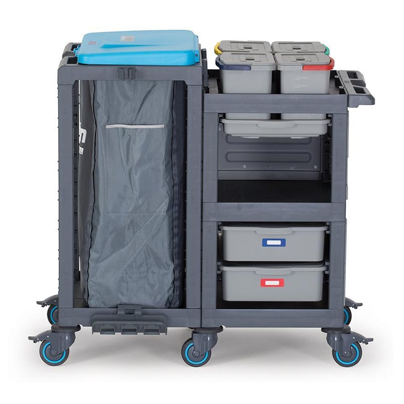 Alışveriş merkezleri, hastane, okul, yurt, fabrika, otel, rezidans gibi işletmelerin temizlik hizmetlerinde pratiklik ve standart sağlar. Kolayca hareket edebilen sessiz, tamponlu ve frenli tekerlekleri sayesinde çarpmalara karşı dayanıklıdır. Frenli tekerlekler ile eğik düzlemlerde sabitleme imkanı sunar. Esnek özellikleriyle hızlı ve pratik bir şekilde servis yapma ve atık toplama imkanı sağlar. Modüler ve ergonomik yapısı ile işlerinizi kolaylaştırır. Opsiyonel aksesuarı ile atık bölmenizi 2 x 60 lt olarak kullanma imkanı sunar. Komple gövde yapısının plastik olması, iç ve dış mekan kullanımlarına olanak sağlar, su ile yapılan temizliklerden hiç bir şekilde etkilenmez ve paslanma yapmaz, ürünün hammaddesinde kimyasal maddelere ve ısıya dayanıklı Poli Propilen malzeme kullanılmıştır. Dört tarafı kapalı iki taraftan açılabilir dolap bölmesi ve tepsili raf sistemi temizlik malzemelerinizi saklama ve depolama imkanı sunar. Modülde kapaklı dolabın her iki yanında, herbiri 120 lt hacminde 2 adet atık toplama imkanı da kullanıcılarına ayrıca sunulmaktadır. Çöp torba kilitleri sayesinde kullanım rahatlığı sağlar. Çöp kapakları üzerindeki atık sınıflandırma renk etiketleri ve görev çizelgeliği sayesinde, birbirinden farklı alanlar için sınıflandırma ve görevliyi denetim imkanı sunarak, uluslararası standartlarda hijyenik ve sağlıklı bir temizlik imkanı sunar.