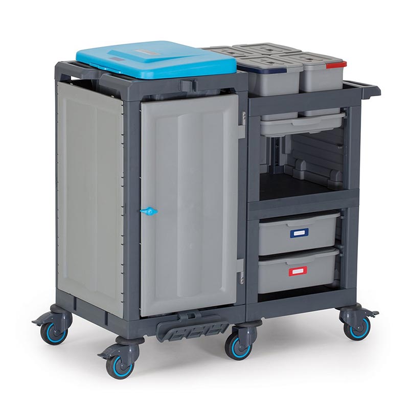 Alışveriş merkezleri, hastane, okul, yurt, fabrika, otel, rezidans gibi işletmelerin temizlik hizmetlerinde pratiklik ve standart sağlar. Kolayca hareket edebilen sessiz, tamponlu ve frenli tekerlekleri sayesinde çarpmalara karşı dayanıklıdır. Frenli tekerlekler ile eğik düzlemlerde sabitleme imkanı sunar. Esnek özellikleriyle hızlı ve pratik bir şekilde servis yapma ve atık toplama imkanı sağlar. Modüler ve ergonomik yapısı ile işlerinizi kolaylaştırır. Opsiyonel aksesuarı ile atık bölmenizi 2 x 60 lt olarak kullanma imkanı sunar. Komple gövde yapısının plastik olması, iç ve dış mekan kullanımlarına olanak sağlar, su ile yapılan temizliklerden hiç bir şekilde etkilenmez ve paslanma yapmaz, ürünün hammaddesinde kimyasal maddelere ve ısıya dayanıklı Poli Propilen malzeme kullanılmıştır. Dört tarafı kapalı iki taraftan açılabilir dolap bölmesi ve tepsili raf sistemi temizlik malzemelerinizi saklama ve depolama imkanı sunar. Modülde kapaklı dolabın her iki yanında, herbiri 120 lt hacminde 2 adet atık toplama imkanı da kullanıcılarına ayrıca sunulmaktadır. Çöp torba kilitleri sayesinde kullanım rahatlığı sağlar. Çöp kapakları üzerindeki atık sınıflandırma renk etiketleri ve görev çizelgeliği sayesinde, birbirinden farklı alanlar için sınıflandırma ve görevliyi denetim imkanı sunarak, uluslararası standartlarda hijyenik ve sağlıklı bir temizlik imkanı sunar.