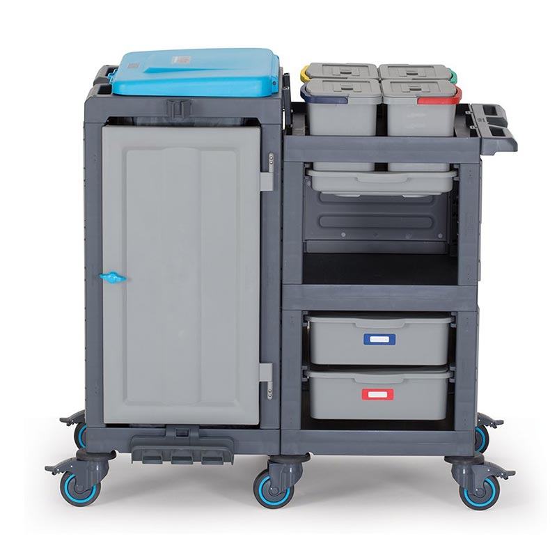 Alışveriş merkezleri, hastane, okul, yurt, fabrika, otel, rezidans gibi işletmelerin temizlik hizmetlerinde pratiklik ve standart sağlar. Kolayca hareket edebilen sessiz, tamponlu ve frenli tekerlekleri sayesinde çarpmalara karşı dayanıklıdır. Frenli tekerlekler ile eğik düzlemlerde sabitleme imkanı sunar. Esnek özellikleriyle hızlı ve pratik bir şekilde servis yapma ve atık toplama imkanı sağlar. Modüler ve ergonomik yapısı ile işlerinizi kolaylaştırır. Opsiyonel aksesuarı ile atık bölmenizi 2 x 60 lt olarak kullanma imkanı sunar. Komple gövde yapısının plastik olması, iç ve dış mekan kullanımlarına olanak sağlar, su ile yapılan temizliklerden hiç bir şekilde etkilenmez ve paslanma yapmaz, ürünün hammaddesinde kimyasal maddelere ve ısıya dayanıklı Poli Propilen malzeme kullanılmıştır. Dört tarafı kapalı iki taraftan açılabilir dolap bölmesi ve tepsili raf sistemi temizlik malzemelerinizi saklama ve depolama imkanı sunar. Modülde kapaklı dolabın her iki yanında, herbiri 120 lt hacminde 2 adet atık toplama imkanı da kullanıcılarına ayrıca sunulmaktadır. Çöp torba kilitleri sayesinde kullanım rahatlığı sağlar. Çöp kapakları üzerindeki atık sınıflandırma renk etiketleri ve görev çizelgeliği sayesinde, birbirinden farklı alanlar için sınıflandırma ve görevliyi denetim imkanı sunarak, uluslararası standartlarda hijyenik ve sağlıklı bir temizlik imkanı sunar.