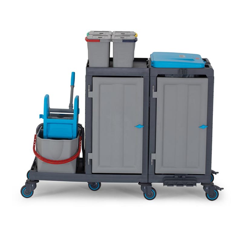 Alışveriş merkezleri, hastane, okul, yurt, fabrika, otel, rezidans gibi işletmelerin temizlik hizmetlerinde pratiklik ve standart sağlar. Kolayca hareket edebilen sessiz, tamponlu ve frenli tekerlekleri sayesinde çarpmalara karşı dayanıklıdır. Frenli tekerlekler ile eğik düzlemlerde sabitleme imkanı sunar. Esnek özellikleriyle hızlı ve pratik bir şekilde servis yapma ve atık toplama imkanı sağlar. Modüler ve ergonomik yapısı ile işlerinizi kolaylaştırır. Opsiyonel aksesuarı ile atık bölmenizi 2 x 60 lt olarak kullanma imkanı sunar. Komple gövde yapısının plastik olması, iç ve dış mekan kullanımlarına olanak sağlar, su ile yapılan temizliklerden hiç bir şekilde etkilenmez ve paslanma yapmaz, ürünün hammaddesinde kimyasal maddelere ve ısıya dayanıklı Poli Propilen malzeme kullanılmıştır. Modülün, her tarafı açıktır ve iki katlıdır. 2 x 25 lt pres kovası, pres ayağı ve dik pres ile zemin temizliğinin kolayca yapılmasına imkan sunar. Dolap bölmesinin üst kısmında farklı renk tutma saplı, 6 lt hacimli 4 adet kova takımını ve alt dolap bölmesini gizleyen çöp kapağı kullanılmıştır. Modül, 120 lt hacminde atık toplama imkanı da kullanıcılarına ayrıca sunmaktadır. Çöp torba kilitleri sayesinde kullanım rahatlığı sağlar. Çöp kapakları üzerindeki atık sınıflandırma renk etiketleri ve görev çizelgeliği sayesinde, birbirinden farklı alanlar için sınıflandırma ve görevliyi denetim imkanı sunarak, uluslararası standartlarda hijyenik ve sağlıklı bir temizlik imkanı sunar.