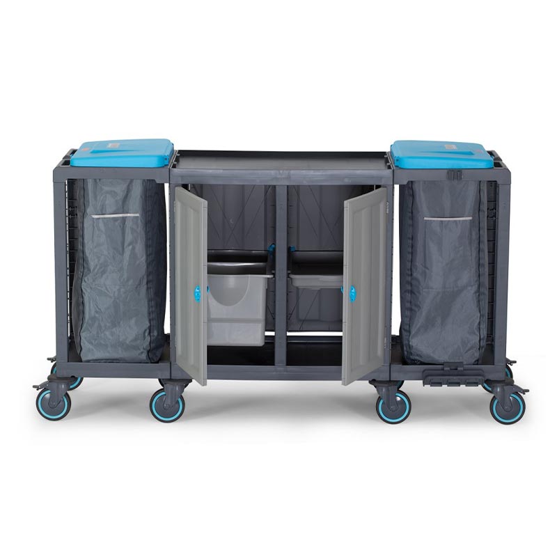 Modül, önden açılabilir 4 tarafı kapaklı 2 ayrı dolap şeklinde dizyn edilmiştir. Kapalı dolapların içinde, her iki bölmedeki ray takımları sayesinde, içine çeşitli temizlik malzemelerinin konulabileceği 2 x 18 lt çekmece takımı ve diğer tarafta 1 adet raf tipi tepsi muhteva etmektedir. Kapalı dolapların her iki yanında ise 2 x 120 lt atık veya çamaşır toplama imkanı da kullanıcılara sunulmaktadır. Çöp torba kilitleri sayesinde kullanım rahatlığı sağlar. Çöp kapakları üzerindeki atık sınıflandırma renk etiketleri ve görev çizelgeliği sayesinde, birbirinden farklı alanlar için sınıflandırma ve görevliyi denetim imkanı sunarak, kat hizmetlerinde uluslararası standart sağlar.