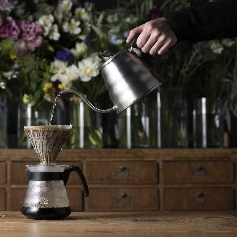 İçerisine filtre kağıdı yerleştirilen V60 Plastik Dripper, set içerisinde yer alan servis sürahisinin üzerine konur. Sıcak su ile filtre kağıdı ıslatılır. Ardından servis sürahisinde toplanan su dökülür. Öğütülmüş kahve filtre kağıdının içerisine konarak el ile hafifçe sallanır ve düz bir yüzey oluşturulur. Hario V60 Kettle içerindeki sıcak su yavaşça dökülür ve kısa bir süre beklenir. Sonra sıcak su merkezden dışa, dıştan merkeze olacak şekilde daireler çizerek yavaşça eklenir. Burada dikkat edilmesi gereken duvarlara yaklaştıkça filtre kağıdına temas etmemesidir. Son olarak su yavaşça merkeze dökülür ve demlenmiş olan kahve servis edilir.
