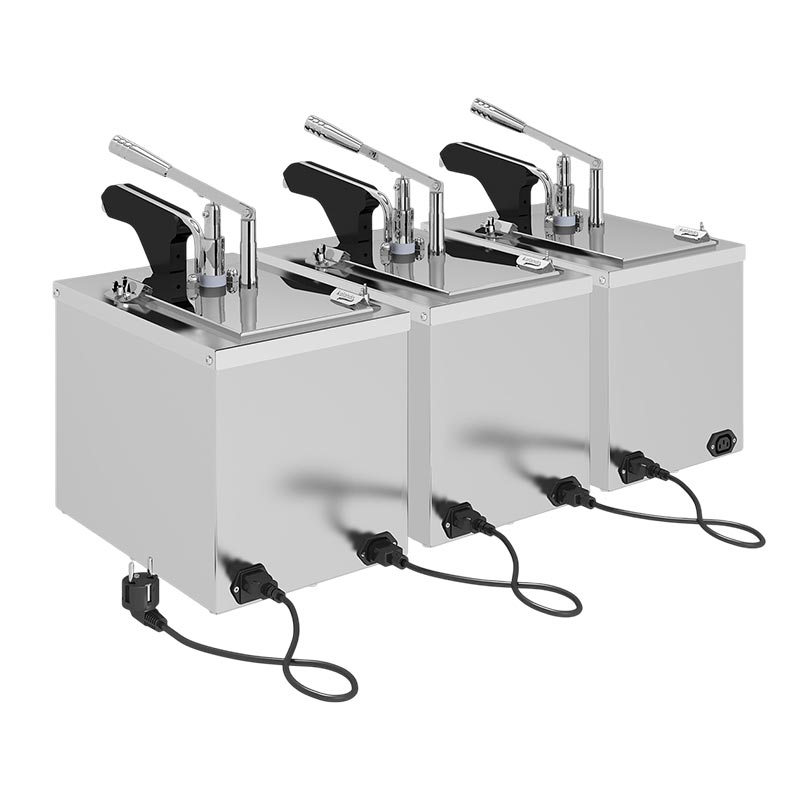 • Isıtmalı benmari dispenseri istenen sıcaklığa hızla ulaşır. Çeşni dağıtıcı 0 ila 90 °C arasında sıcaklık seviyelerinde çalışır. Optimum ısı transferi için, dağıtıcı önce bir su banyosunu ısıtır ve ardından sıcaklığı sosun bulunduğu kaba iletir. Bu, eşit ısı dağılımı sağlar ve sos kabının değiştirilmesini ve temizlenmesini kolaylaştırma avantajına sahiptir.