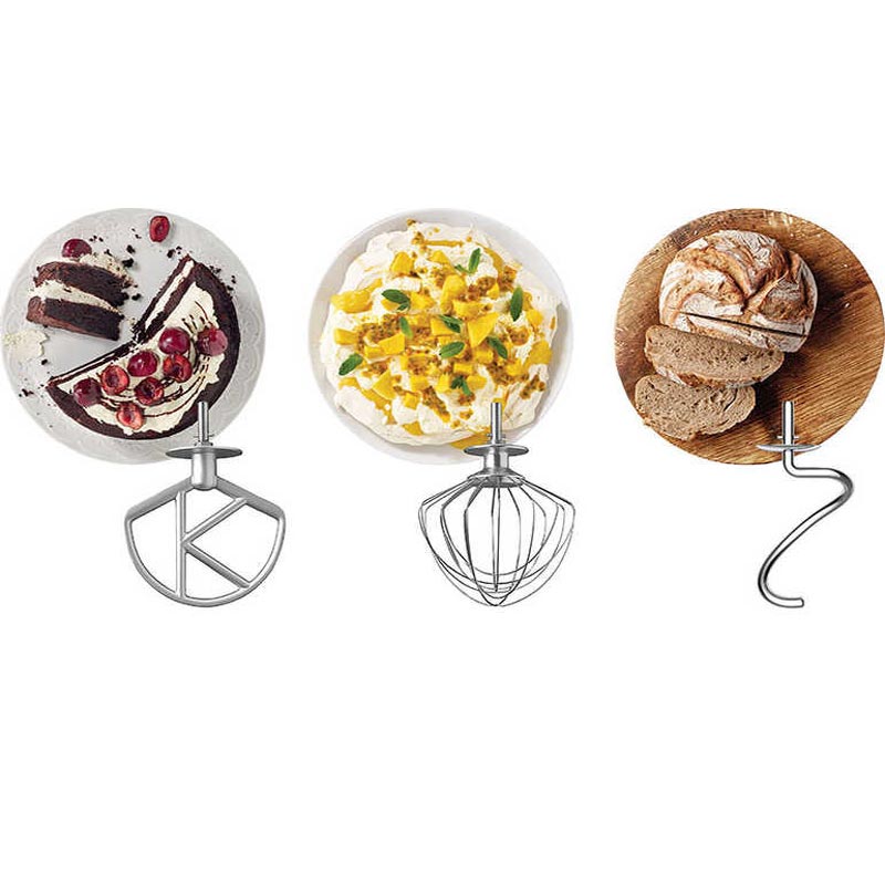 Eşlik eden kase aletleri, K-Çırpıcı, çırpma teli ve hamur kancası, aromalı ekmekler, şık kekler ve baştan çıkarıcı Pavlovasları kolaylıkla oluşturmanıza olanak tanır.