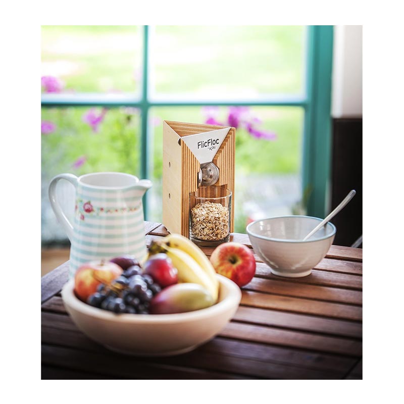 Yulaf ezmesini seviyor musunuz? Taze ezilmiş yulaf daha fazla besin maddesine ve lezzete sahiptir. Bu lezzeti artık kendi evinizde kolayca hazırlayabilirsiniz. FlicFloc, her türlü tahıl (mısır hariç), yağlı tohumlar ve bitkileri pul pul ezen bir makinadır. Huniye istediğiniz tahılları koyun, kolu birkaç kez çevirin ve taze ezilmiş tahıllar elde edin. FlicFloc, kayın ağacından yapılmış gövdesi ile şık bir görünüme sahiptir. Cihazınızı özel masa kelepçesi ile tezgâhınıza rahatlıkla sabitleyebilirsiniz. Kullanımı çok kolay ve yalnızca 20 cm yüksekliğe sahip olan FlicFloc mutfağınızda çok az yer kaplar. FlicFloc ezme tekniği sayesinde ezme kalınlığını ayarlamanıza gerek yoktur Artık müslinizi sabahları taze olarak hazırlayabilirsiniz!