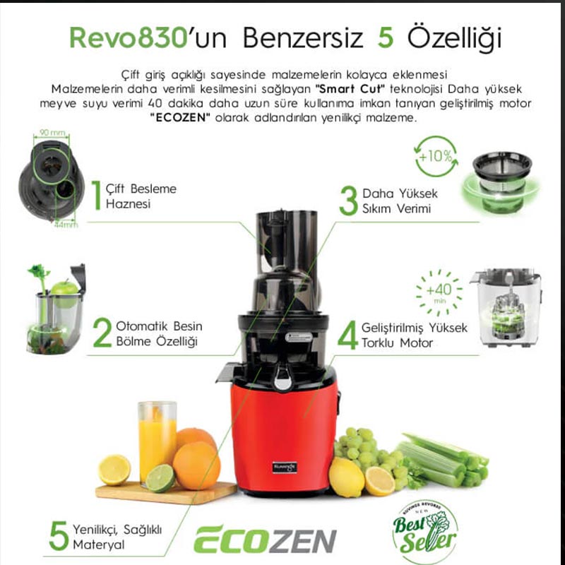 • REVO830, gücün yeniden tanımıdır. Bu devrim niteliğindeki meyve sıkacağı, piyasada bulabileceğiniz en güçlü motorlardan birine sahip. Tasarımın zirvesindeki bu cihaz, sadece sıradan bir meyve sıkacağı olmanın ötesinde, yüksek tork kapasitesiyle en katı meyveleri bile rahatlıkla sıkar.