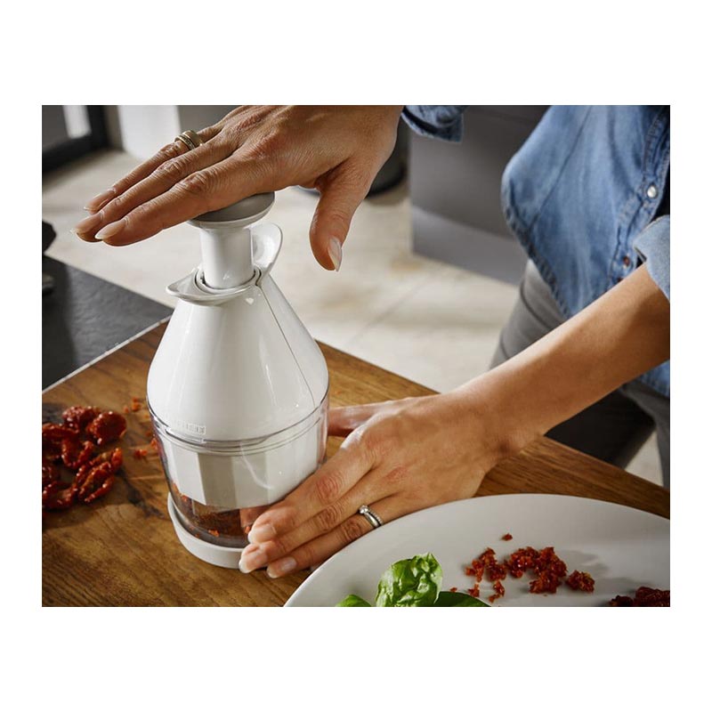 • Kolayca kavranan düğme, soğanları, sarımsakları, sebzeleri, kuruyemişleri ve çikolatayı zahmetsizce ve eşit şekilde doğrayan ekstra keskin paslanmaz çelik bıçağı harekete geçirir.