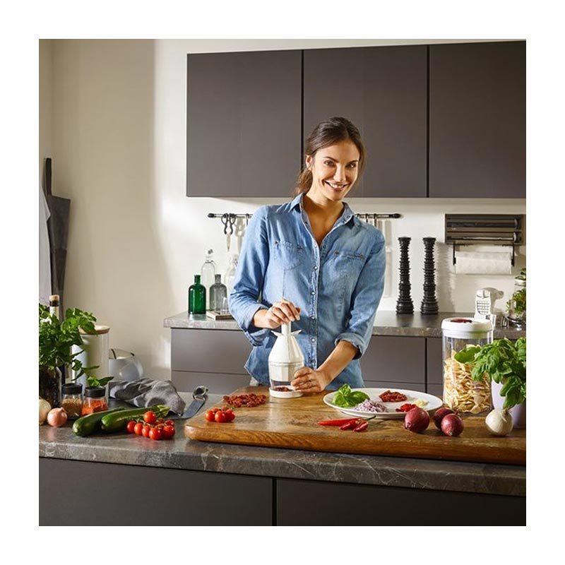 • Leifheit Comfort & Clean, kullanışlı bulaşık makinesinde yıkanabilir manuel gıda parçalayıcı, yenilikçi döner bıçak hareketi sayesinde yiyecekleri ve sebzeleri eşit şekilde keser.