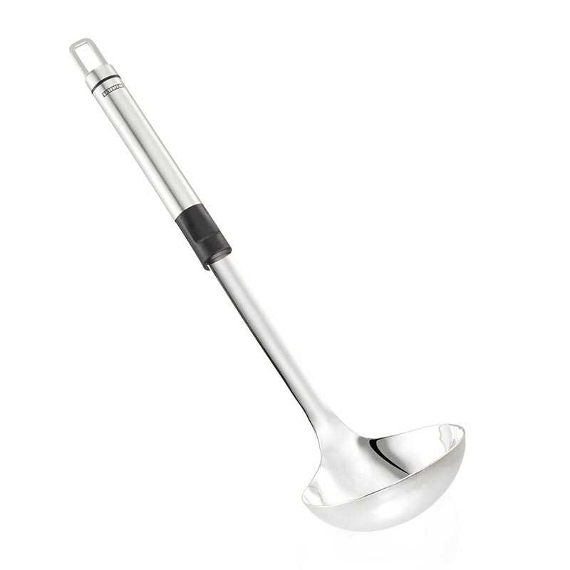 Leifheit Proline'ın bu büyük çorba kaşığı paslanmaz çelikten ve siyah plastikten yapılmıştır ve bu nedenle zarif bir tasarıma sahiptir.