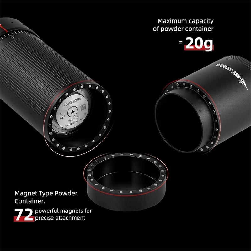 Gövdesinde 72 adet mıknatısla donatılmış olan öğütüm haznesi değirmenin tabanına güvenli bir şekilde takılarak dökülmeye karşı korumalı kullanım sağlar. Alt ızgarayı çıkararak artırabileceğiniz geniş bir (20g) kapasiteye sahiptir.