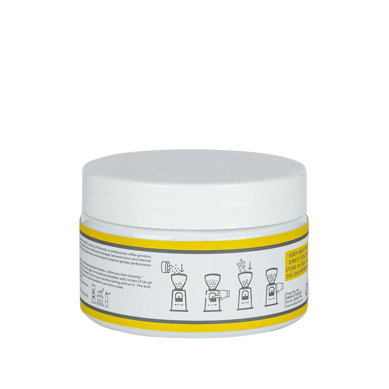 Ev tipi veya Profesyonel Kahve öğütücülerinin periyodik temizliklerinde uygulanan %100 doğal bir temizleyicidir. İnsan sağlığına zarar vermez, metal alaşımları bozmaz, doğal ve gluten içermeyen bir temizleyicidir. Organik glütensiz tahıllar ve gıdayla uyumlu birleştiriciler içerir. Kahve değirmenlerinde zamanla oluşan yağları, öğütücünün disklerine yapışmış küçük parçacıkları, dolayısı ile oluşabilen pis kokuları giderir, disklerinizin uzun ömürlü kalmasını sağlarsınız. Öğütücünüzü detaylı temizlik için parçalarına ayırmanıza gerek yoktur. Sadece kahve haznesini boşaltıp içerisine belirtilen miktarda temizleyici toz koymanız ve öğütücünüzü çalıştırmanız yeterli olacaktır.