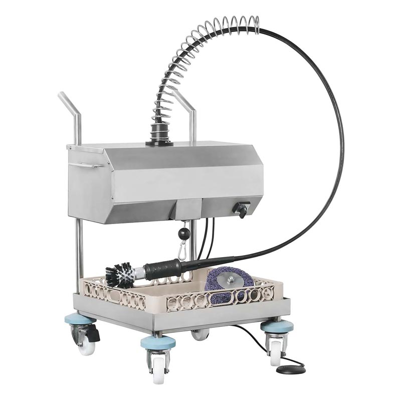 • Bu sistem ister kazan yıkama eviyelerinin üzerine monte edilerek kullanılabileceği gibi istenirse mutfak içinde hareket edebilen tekerlekli özel arabası ile mutfağın içinde her yerde mobil temizlik fırçası olarak da kullanılabilir. Sabit olarak kullanıldığında makine gövdesi yerden 1.15m yüksekliğe monte edilmelidir. Kazan yıkama makinesinde 2 adet farklı fırça bulunmaktadır. Birincisi yıkama fırçası diğeri parlatma fırçasıdır. Yıkama fırçası ile kazan ve tencerelerdeki kirleri yüksek ısılı sıcak su ile el değmeden ve güç harcamadan kolayca temizleme yapılmaktadır. Diğer fırça ile tencerelerinizde meydana gelen kararma ve kazan diplerindeki taban yanıklarının kolayca parlatılma işlemi yapılmaktadır.