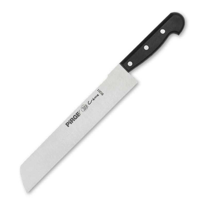 Creme Hamur Bıçağı Çeneli 27 cm ile düz yüzeylerde hazırlanmış hamurları kolaylıkla dilimleyebilirsiniz. Erişte yapmak, mantı için kare parçalar hazırlamak bu ürünle çok kolay.