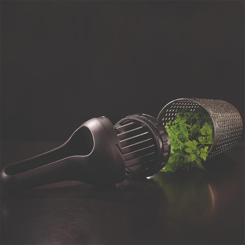• Yıkama ve doğrama - entegre doğrama bıçağına sahip yenilikçi RÖSLE bitki duşu, taze bitkilerin tek bir ürünle rahatça yıkanmasını ve kompakt bir şekilde doğranmasını sağlar. Delikler suyun doğrudan içeri akmasını ve süzülmesini sağlar ve otların üzerindeki kir parçacıkları yıkanarak uzaklaştırılır. Yıkadıktan sonra çalkalayarak kurulayın! Doğrama bıçağı akıllıca ve güvenli bir şekilde sapta saklanabilir ve gerektiğinde kolayca çıkarılabilir. Ergonomik sap ele tam oturur ve taze otları anında küçük parçalar halinde keser.