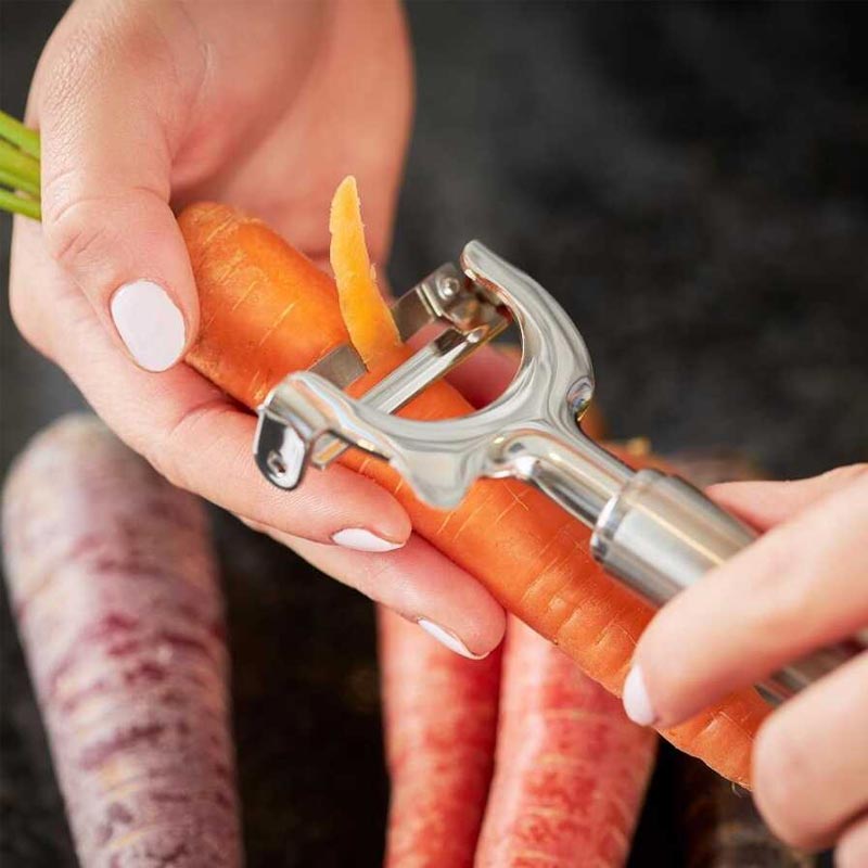 Şekli nedeniyle fazla güç kullanmadan salatalık, havuç veya kabak gibi uzun, ince sebzeleri soymak için idealdir.