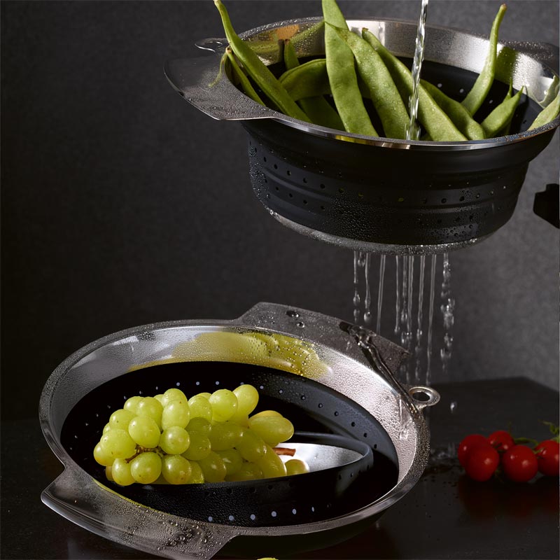 • Sebze ve makarnaları süzmek ve salataları yıkamak için. Yan ve taban üzerinde eşit olarak dağıtılmış delikler hızlı ve verimli drenaj sağlar. Tabandaki üç çukur sabit bir dinlenme pozisyonu sağlar. Silikon yan duvarlar, yerden tasarruf sağlayan saklama ve bulaşık makinesinde temizlik için yalnızca 4 cm/1,6 inç yüksekliğe kadar kolayca katlanmasını sağlar.