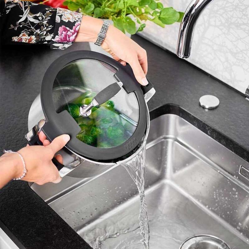 Entegre boşaltma işlevine sahip yenilikçi kapak ve tutacakları süzgeç yerine geçer.